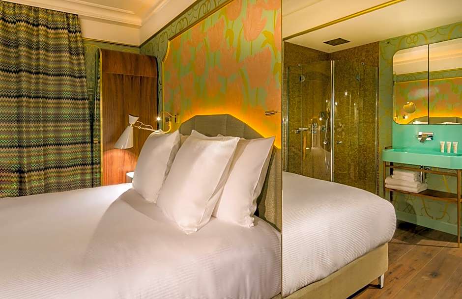 This double room features a mini-bar, soundproofing and air conditioning. There is a shower cubicle which opens on to the bedroom.